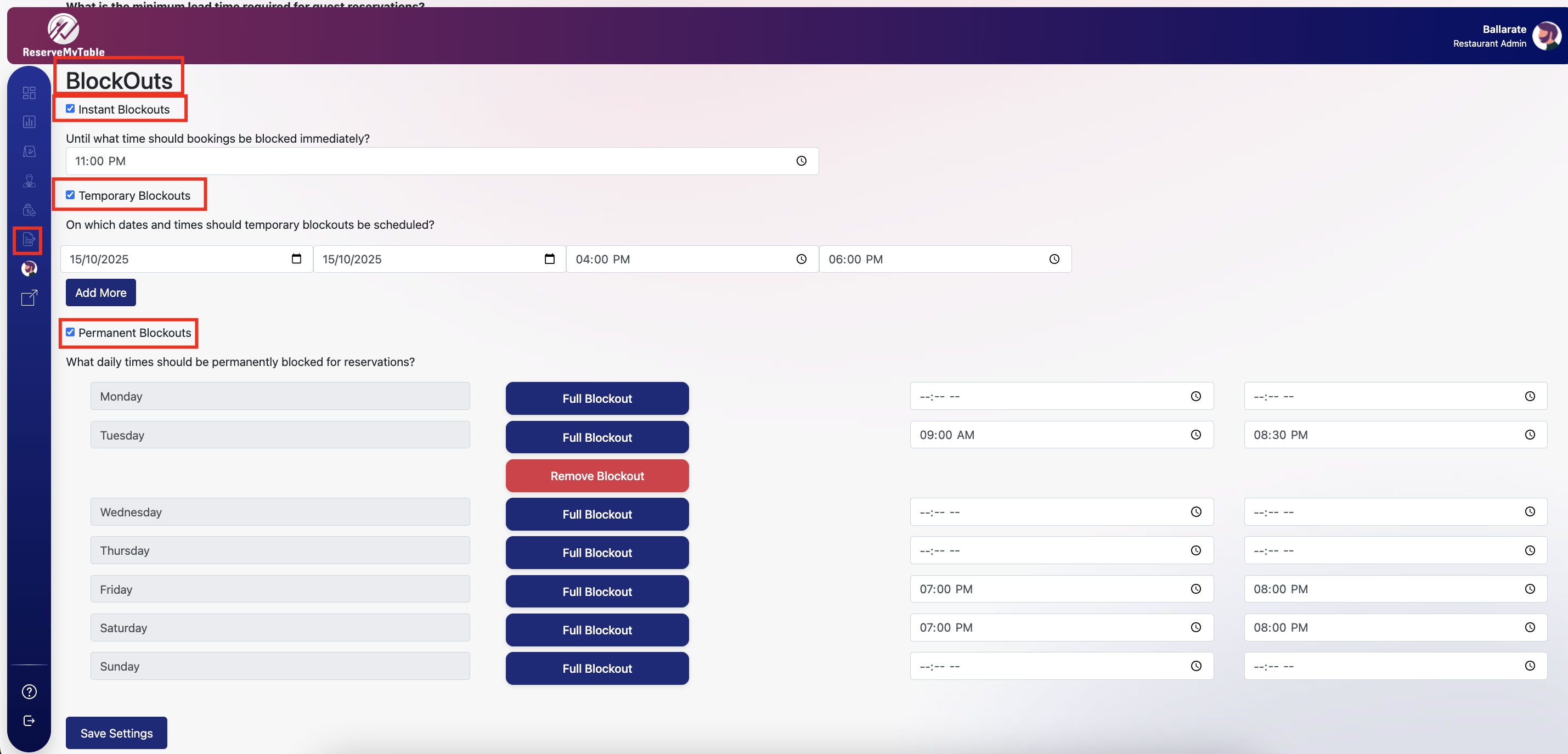 The system automatically blocks unavailable slots once your tables are fully booked.